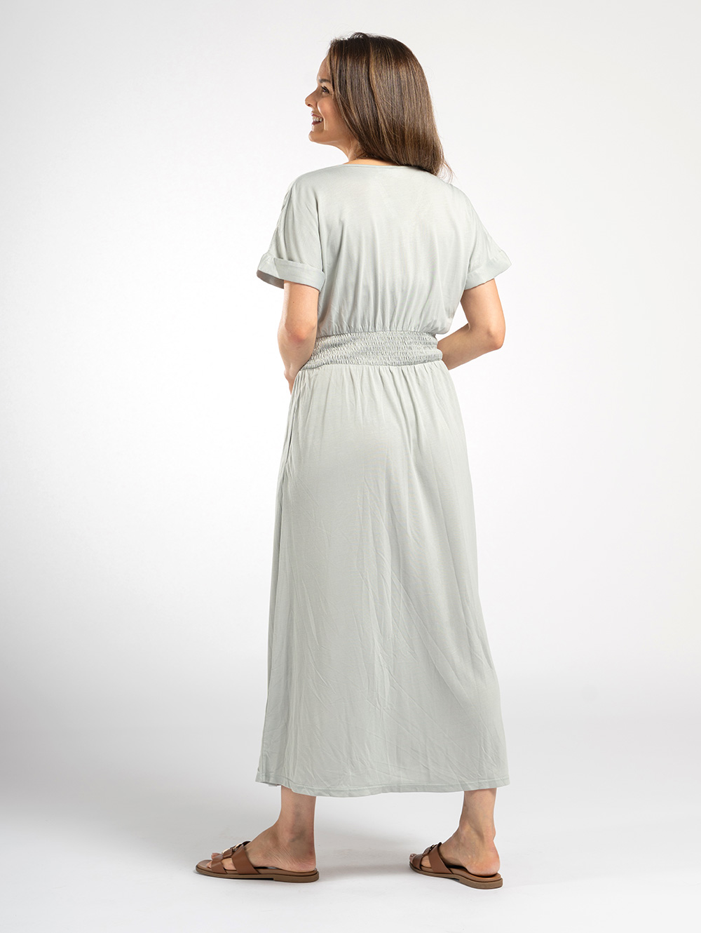 Elevate your summer wardrobe with this teal midi dress. With comfy shirring at the waist and loose short sleeves it falls to a flowing silhouette with the jersey fabric creating a swishy movement with a beautiful drape.